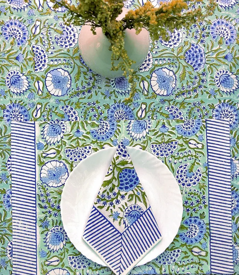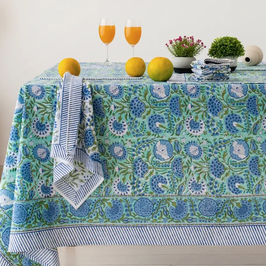 Hand Printed Cotton Table Cloth | Green & Blue
