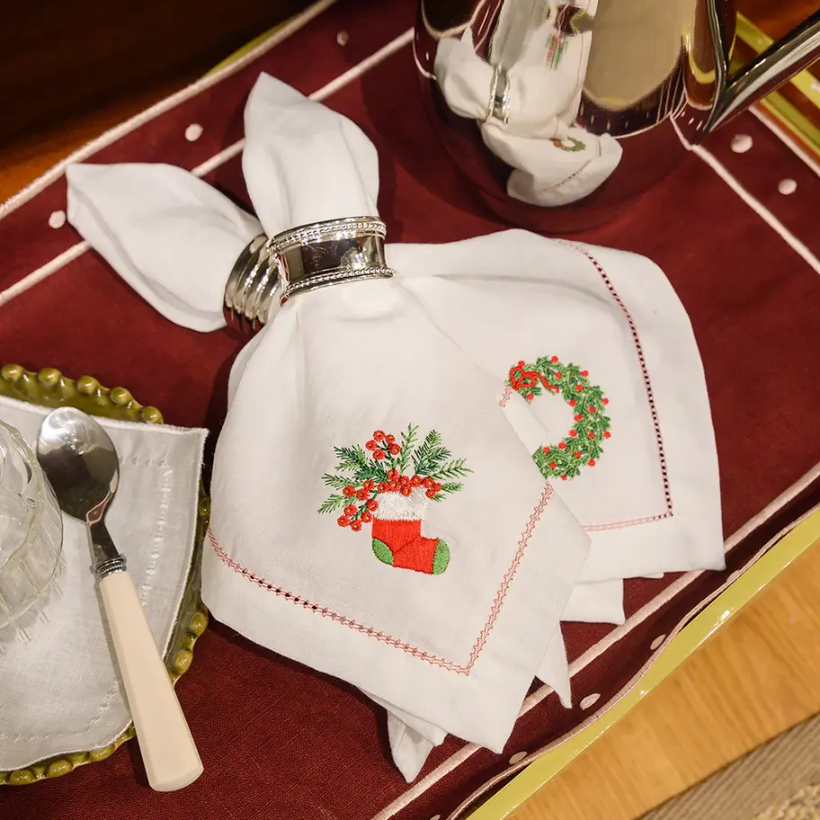 Add Christmas charm to the table with white linen napkins embroidered