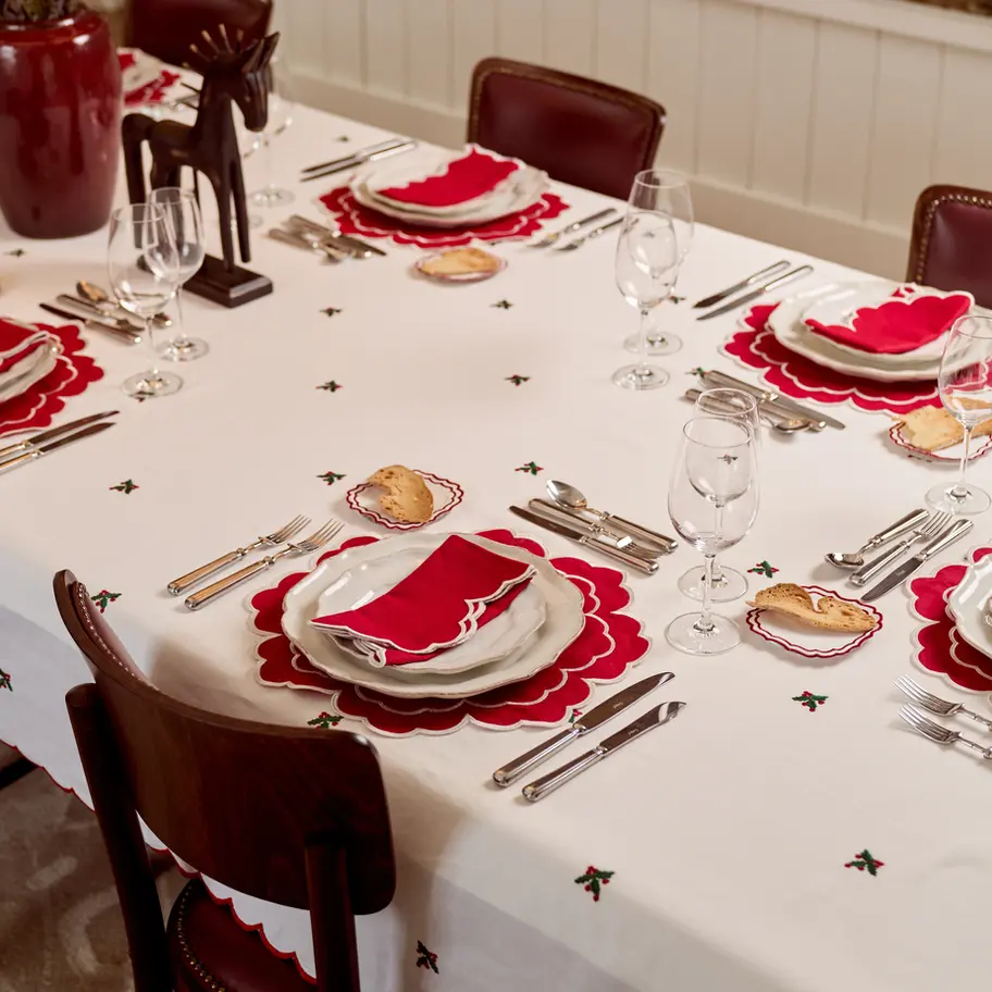 Set your table for the festive season with our elegant Holly Embroidered Tablecloth. Featuring delicate holly embroidery and a red scalloped border, this tablecloth adds a festive and welcoming touch.